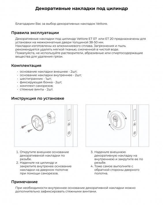Накладка VЕTTORE ET 0701 подходит для любых типов дверей. Идет к серии ручек на тонком основании R07.Материал: цинковый сплав.