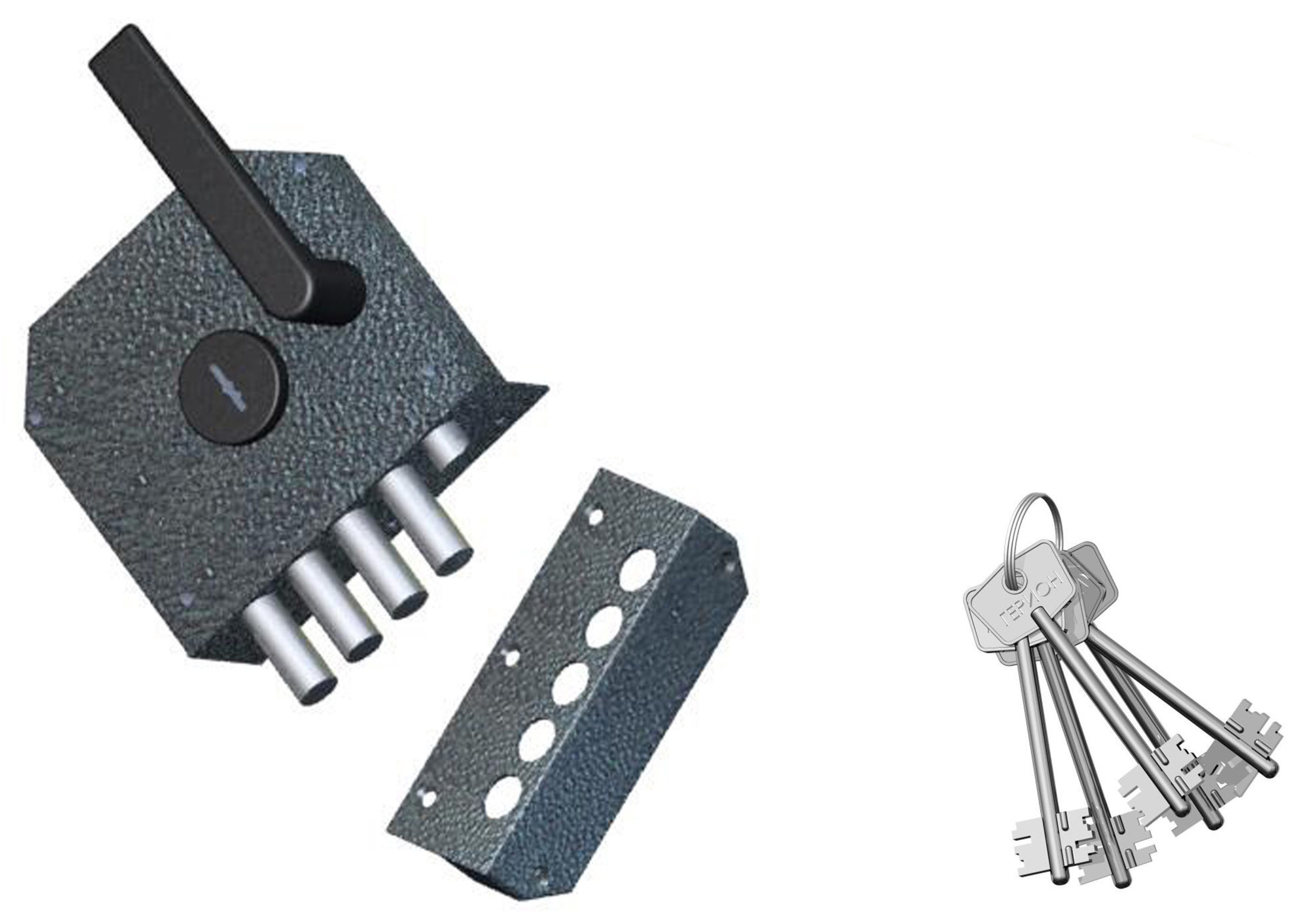 Запирание поворотом ключа обеспечивает ригель, имеющий четыре пальца диаметром 17 мм с вылетом 42 мм. Защелка обеспечивает фиксацию двери и приводится в действие ручкой.