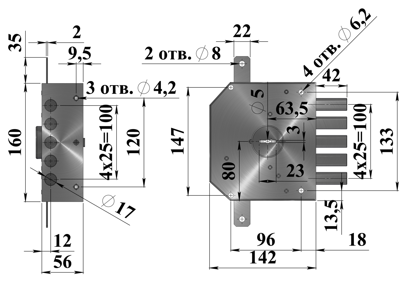 Запирание поворотом ключа обеспечивает ригель, имеющий пять пальцев диаметром 17 мм с вылетом 42 мм. Дополнительные тяги имеют ход 20 мм и обеспечивают запирание двери вверху и внизу.