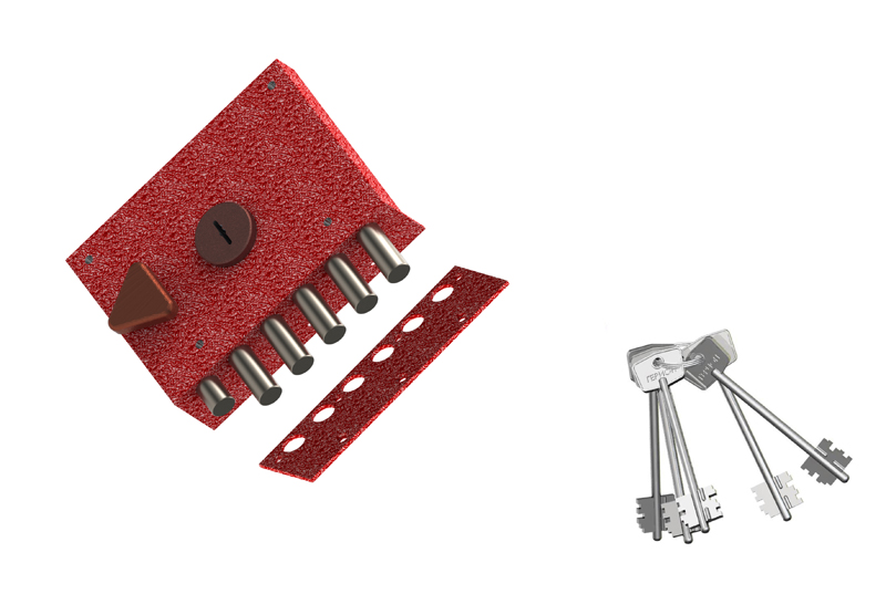 Замок накладной с пятипалым ригелем, двумя дополнительными тягами и внутренней задвижкой. Имеет 8и-сувальдный блокирующий механизм сейфового типа. Замок сертифицирован 3 классом по ГОСТ 5089-2011, сохраняет работоспособность после попадания в скважину посторонних предметов. Запирание двери обеспечивает повышенную сопротивляемость к взлому и высокую степень защиты. Толщина корпуса замка 26 мм. Основной засов, состоящий из пяти пальцев диаметром 18 мм, имеет вылет 40 мм и приводится в действие с помощью ключа. Внутренняя задвижка работает от треугольной ручки.