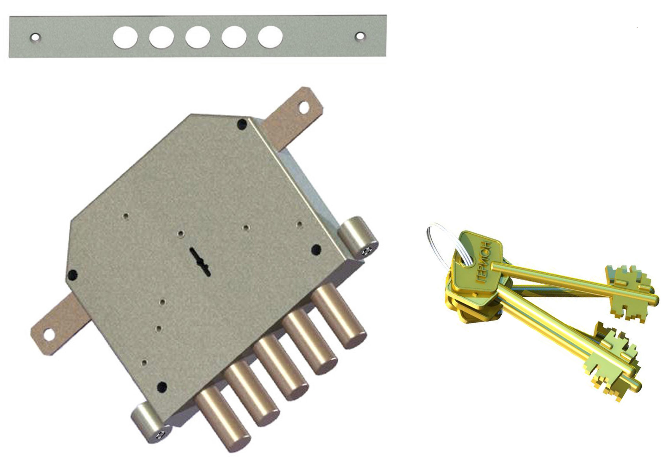 Запирание поворотом ключа обеспечивает ригель, имеющий пять пальцев диаметром 17 мм с вылетом 42 мм. Дополнительные тяги имеют ход 20 мм и обеспечивают запирание двери вверху и внизу.