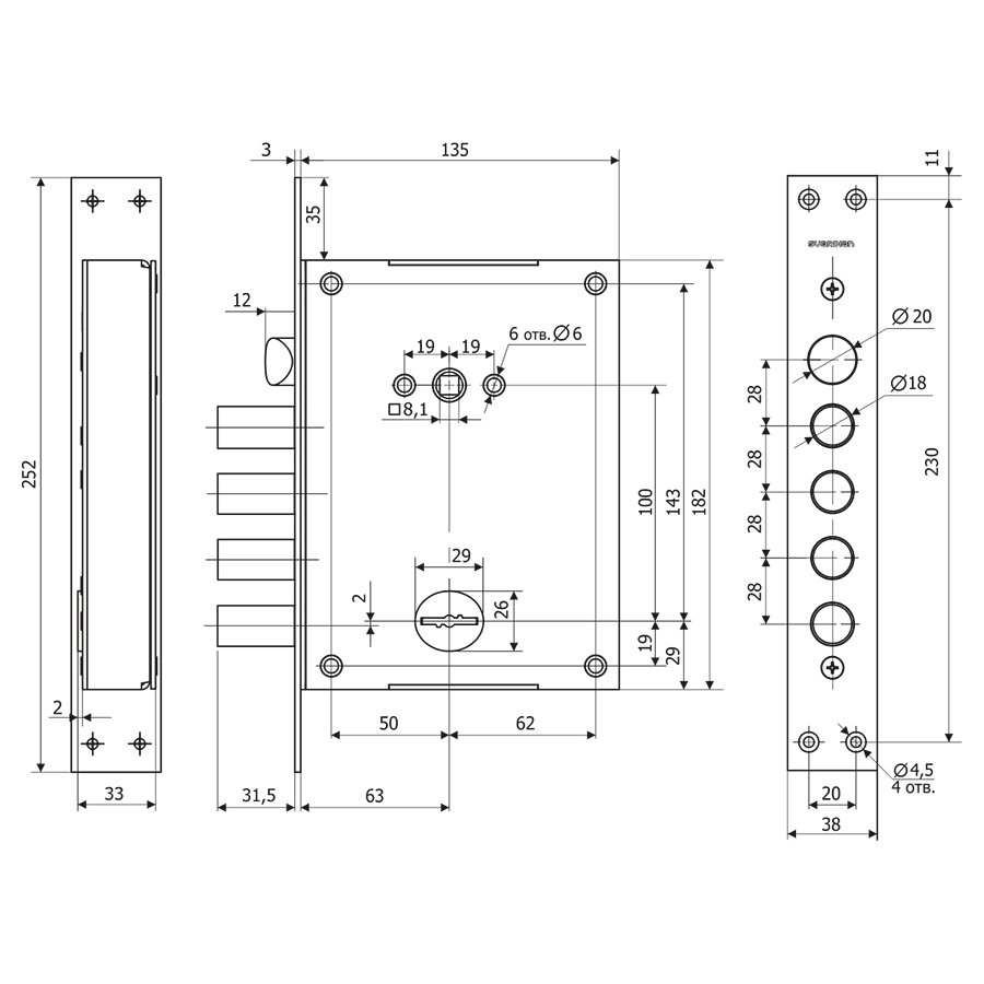 — Защита от вскрытия отмычкой – наличие ложных пазов и отсеченная зубчатая втулка, которая при повороте ключа перекрывает боковое отверстие замочной скважины и ограничивает доступ отмычек к сувальдам через замочную скважину