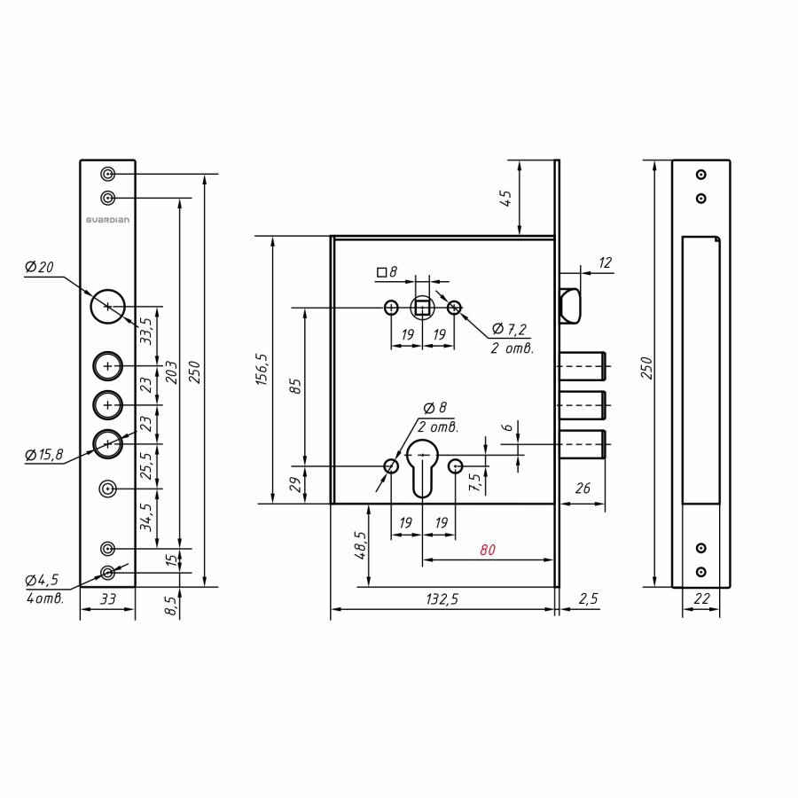 Отверстия для крепления врезной броненакладки усилены втулками для защиты корпуса замка от деформации.