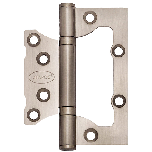 Универсальная петля Итарос без врезки (также называемая петля «бабочка» или накладная дверная петля) с двумя подшипниками (13 стальных шариков в каждом) сделана из высокопрочной закаленной стали толщиной 2,5 мм, применяется в качестве шарнирной фурнитуры при установке современных межкомнатных дверей. Благодаря подшипникам качения, петля без врезки обеспечивает мягкость хода дверного полотна при открывании и закрывании. Кроме того, петля бабочка практически не подвержена стиранию при трении – она имеет качественное гальваническое покрытие, которое защищает ее от царапин и придает блеск.