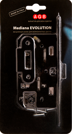Врезная бесшумная защелка  WC серии MEDIANA EVOLUTION предназначен для установки в межкомнатные двери. Подходит для левых и правых дверей. Более тихий замок благодаря новой конструкции и новым внутренним компонентам. Бесшумная пластиковая защелка с двойным наклоном может фиксироваться ключом внутри замка (при перевозке деревянного полотна). Новая защищенная патентом система поворота защелки.