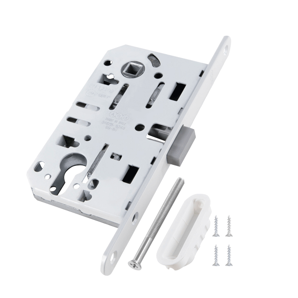 Замок межкомнатный под цилиндр. Тех упаковка. Защелка MEDIANA POLARIS с магнитным язычком отличается необычайной бесшумностью, при нажатии на дверную ручку происходит разрыв между двумя магнитами и защелка втягивается в корпус замка. Модель разработана инженерами компании AGB и объединяет в себе надежность, качество, точность механических соединений и инновации. Все замки серии Polaris имеют один размер и взаимозаменяемы между собой.