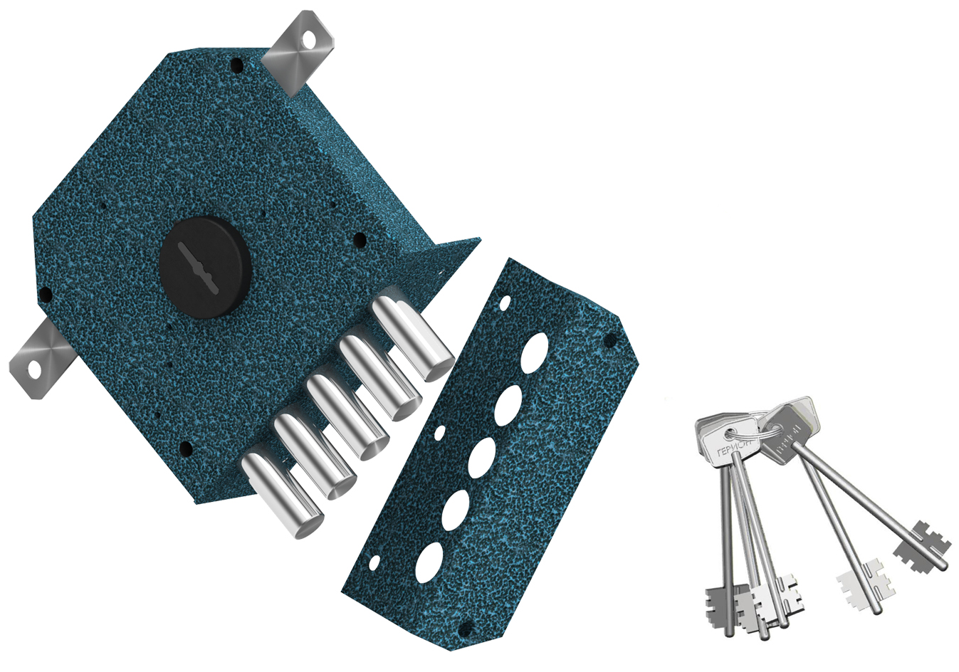 Замок накладной с пятипалым ригелем и двумя дополнительными тягами. Имеет 8и-сувальдный блокирующий механизм сейфового типа.