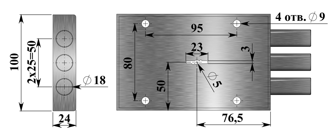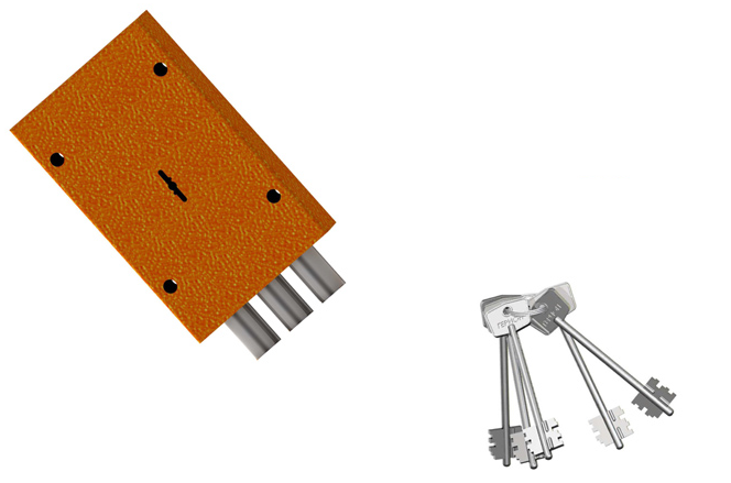 Замок накладной с трехпалым ригелем и 8и-сувальдным блокирующим механизмом сейфового типа. Замок сертифицирован 3 классом по ГОСТ 5089-2011, сохраняет работоспособность после попадания в скважину посторонних предметов. Основной ригель, состоящий из трех пальцев диаметром 18 мм, имеет вылет 42 мм и приводится в действие с помощью ключа. Толщина корпуса замка 24 мм.