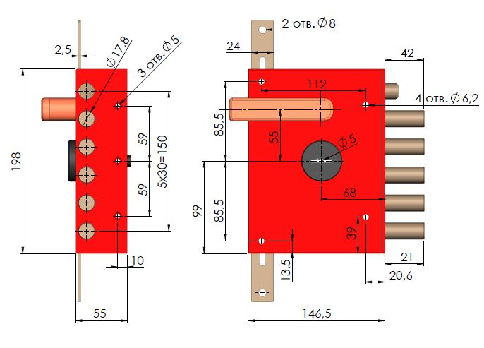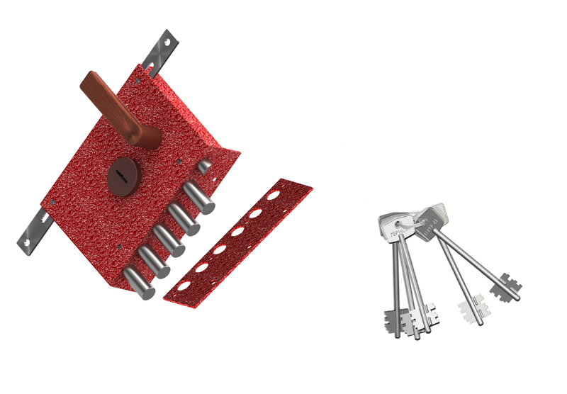 Замок накладной с пятипалым ригелем, фалевой защелкой и двумя дополнительными тягами. Имеет 8и-сувальдный блокирующий механизм сейфового типа. Замок сертифицирован 3 классом по ГОСТ 5089-2011, сохраняет работоспособность после попадания в скважину посторонних предметов. Запирание двери в трёх направлениях обеспечивает повышенную сопротивляемость к взлому и высокую степень защиты. Выпускается правого и левого исполнения. Толщина корпуса замка 26 мм. Основной засов, состоящий из пяти пальцев диаметром 18 мм, имеет вылет 40 мм и приводится в действие с помощью ключа, дополнительные тяги имеют ход 20 мм и обеспечивают запирание двери вверху и внизу. Защелка обеспечивает фиксацию двери и приводится в действие ручкой.