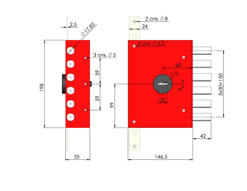 Замок накладной с шестипалым ригелем и двумя дополнительными тягами. Имеет 8и-сувальдный блокирующий механизм сейфового типа. Замок сертифицирован 3 классом по ГОСТ 5089-2011, сохраняет работоспособность после попадания в скважину посторонних предметов. Запирание двери в трёх направлениях обеспечивает повышенную сопротивляемость к взлому и высокую степень защиты. Толщина корпуса замка 26 мм. Основной засов, состоящий из 6и пальцев, диаметром 18 мм имеет вылет 40 мм и приводится в действие с помощью ключа, дополнительные тяги имеют ход 20 мм и обеспечивают запирание двери вверху и внизу.