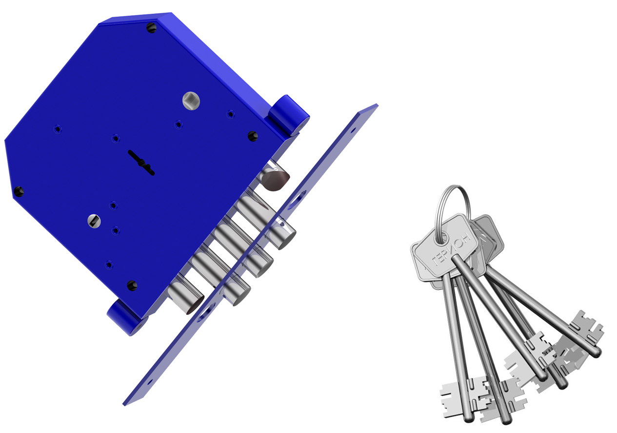 Замок врезной с трехпалым ригелем, бонками, фалевой защелкой и внутренней задвижкой. Имеет 8и-сувальдный блокирующий механизм сейфового типа.
