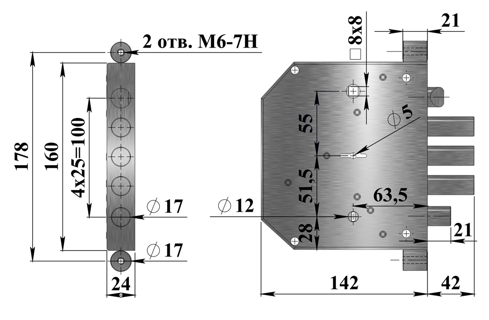 Выпускается правого и левого исполнения. Толщина корпуса замка 24 мм.