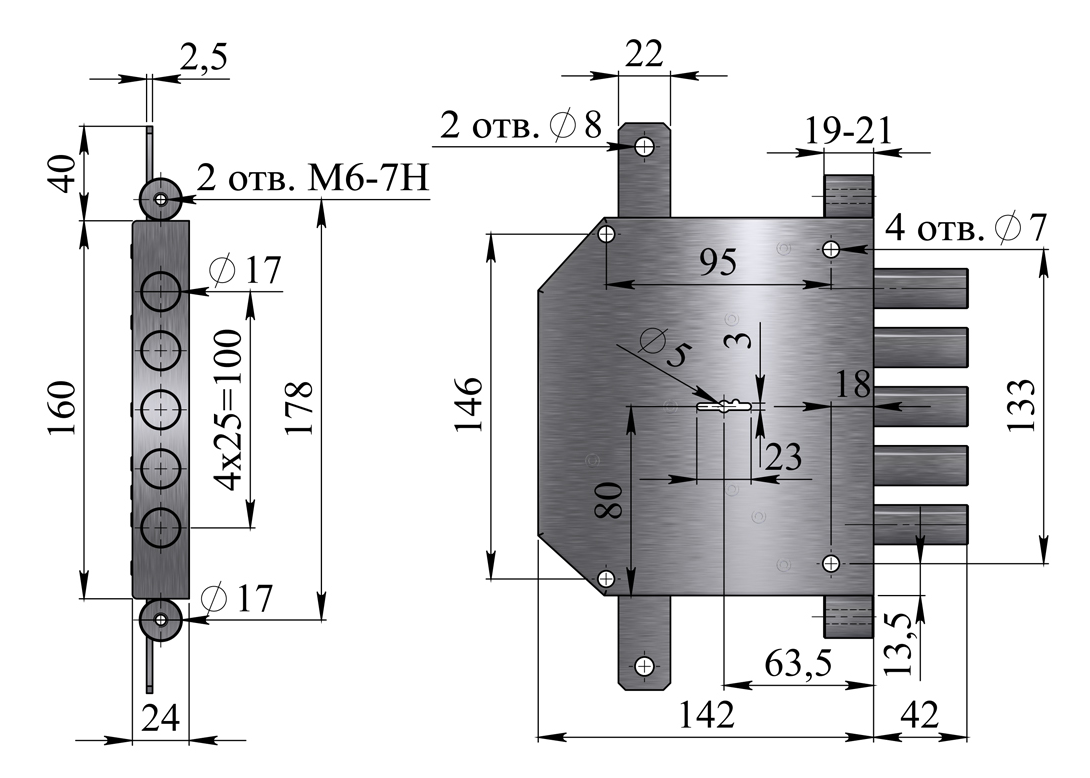 Запирание поворотом ключа обеспечивает ригель, имеющий пять пальцев диаметром 17 мм с вылетом 42 мм. Дополнительные тяги имеют ход 20 мм и обеспечивают запирание двери вверху и внизу.
