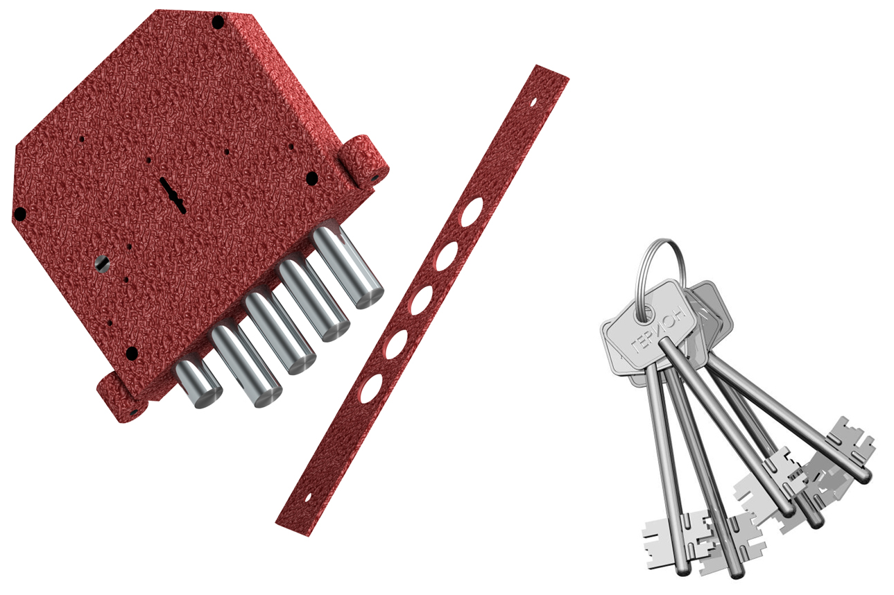Запирание поворотом ключа обеспечивает ригель, имеющий четыре пальца диаметром 17 мм с вылетом 42 мм. Внутренняя задвижка работает от треугольной ручки.