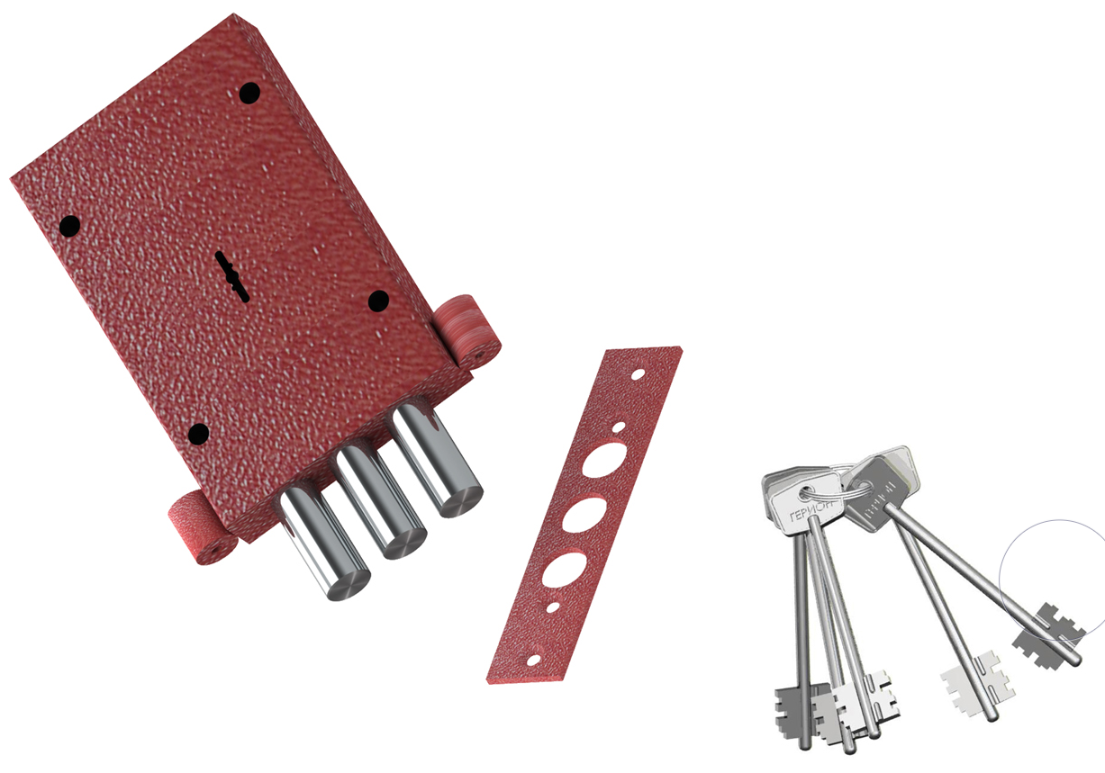 Замок врезной с трехпалым ригелем, бонками и 8и-сувальдным блокирующим механизмом сейфового типа. Замок сертифицирован 3 классом по ГОСТ 5089-2011, сохраняет работоспособность после попадания в скважину посторонних предметов. Основной ригель, состоящий из трех пальцев диаметром 18 мм, имеет вылет 42 мм и приводится в действие с помощью ключа. Толщина корпуса замка 24 мм. Крепится через 2 отверстия М6 в бонках.В модификации Стилет Б-01 — сертифицирован высшим 4 классом по ГОСТ 5089-2011.