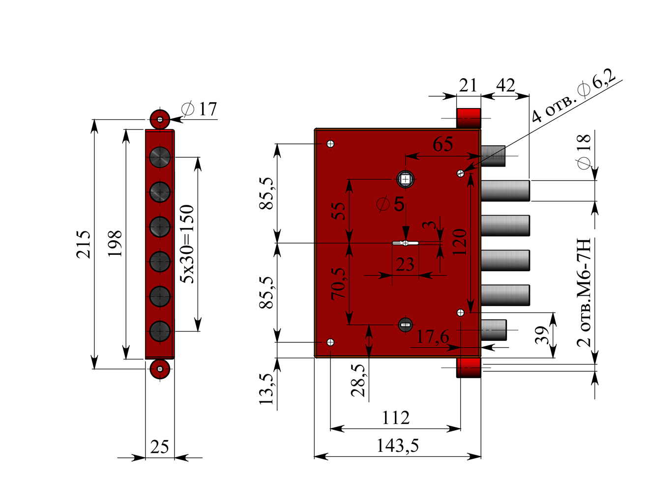 Замок врезной с фалевой защелкой и внутренней задвижкой. Имеет 8и-сувальдный блокирующий механизм сейфового типа. Замок сертифицирован 3 классом по ГОСТ 5089-2011, сохраняет работоспособность после попадания в скважину посторонних предметов. Запирание двери обеспечивает повышенную сопротивляемость к взлому и высокую степень защиты. Выпускается правого и левого исполнения. Толщина корпуса замка 26 мм. Основной засов, состоящий из четырех пальцев диаметром 18мм, имеет вылет 40мм и приводится в действие с помощью ключа. Защелка обеспечивает фиксацию двери и приводится в действие ручкой. Внутренняя задвижка работает от треугольной ручки. Крепится через 2 отверстия М6 в бонках.