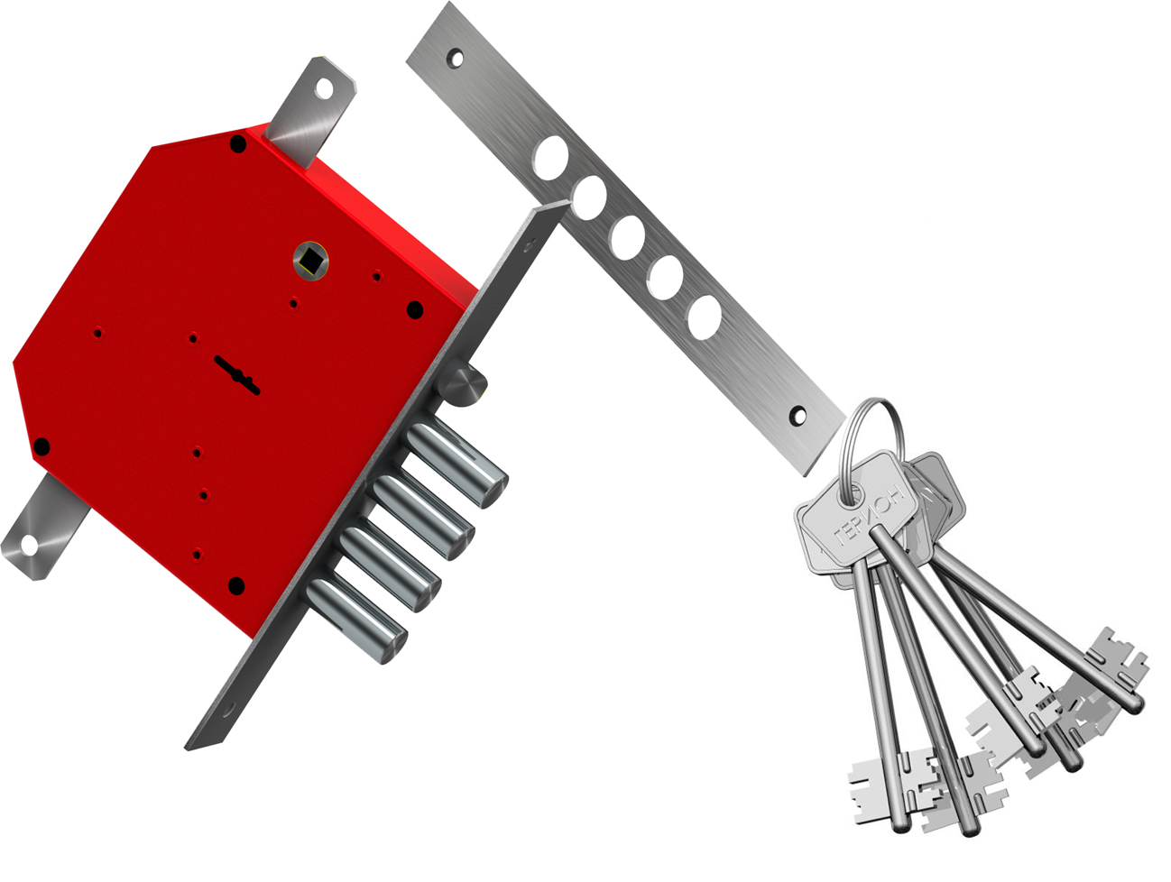 Запирание поворотом ключа обеспечивает ригель, имеющий четыре пальца диаметром 17 мм с вылетом 42мм. Дополнительные тяги имеют ход 20 мм и обеспечивают запирание двери вверху и внизу. Защелка обеспечивает фиксацию двери и приводится в действие ручкой.