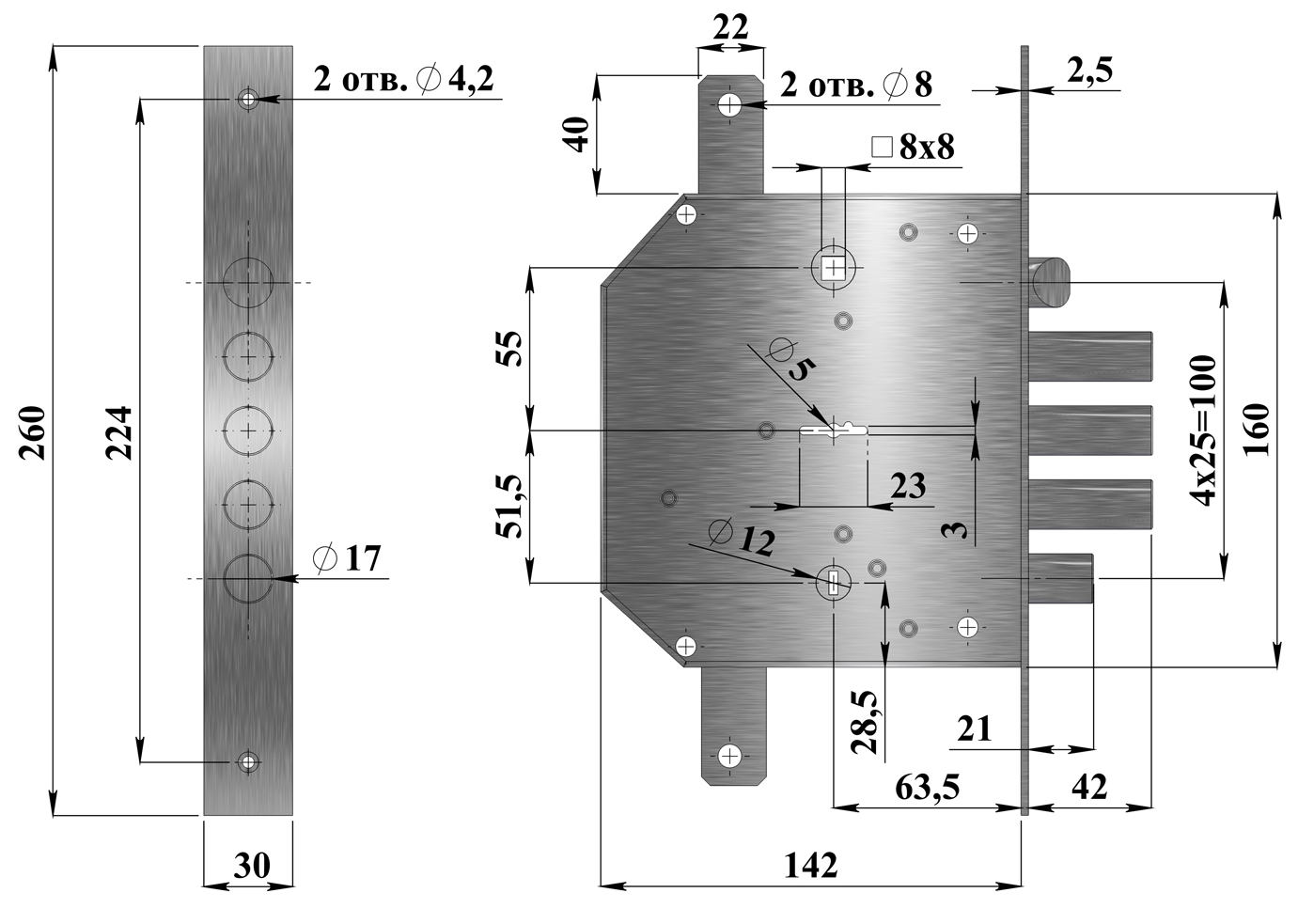 Замок врезной с четырехпалым ригелем, фалевой защелкой и двумя дополнительными тягами. Имеет 8и-сувальдный блокирующий механизм сейфового типа.