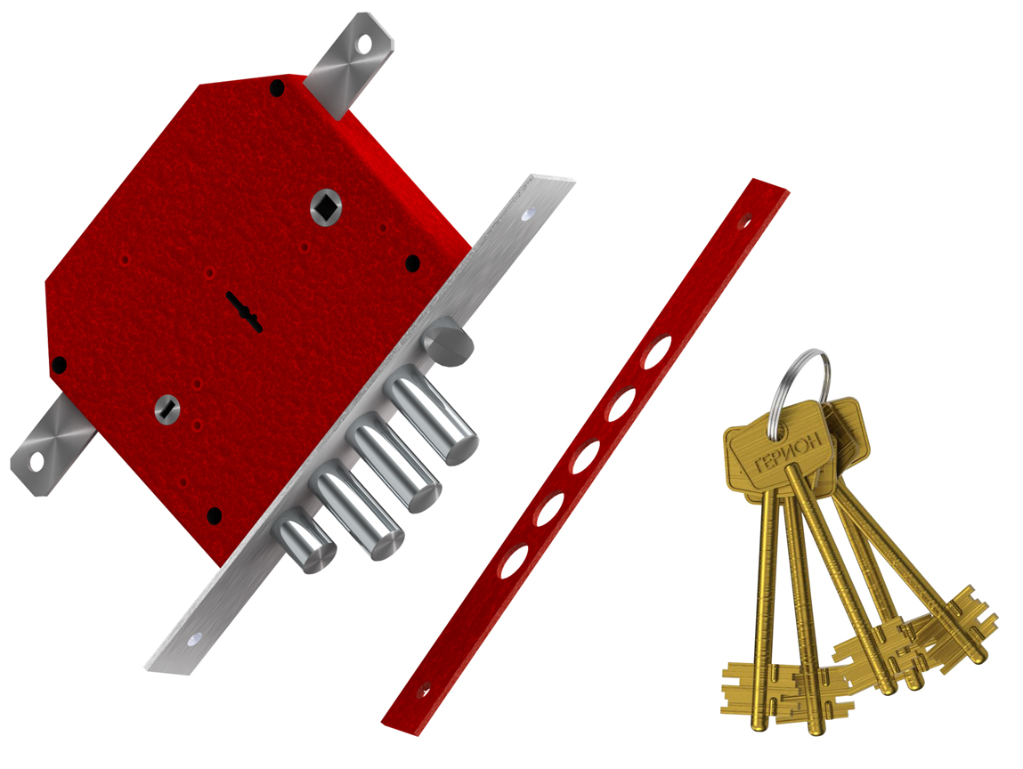 Запирание поворотом ключа обеспечивает ригель, имеющий три пальца диаметром 17 мм с вылетом 42 мм. Дополнительные тяги имеют ход 20 мм и обеспечивают запирание двери вверху и внизу. Защелка обеспечивает фиксацию двери и приводится в действие ручкой. Внутренняя задвижка работает от треугольной ручки.