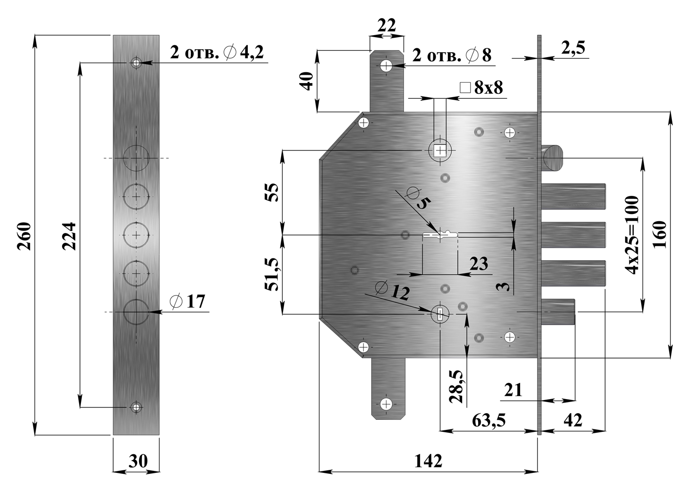 Замок врезной с трехпалым ригелем, фалевой защелкой, двумя дополнительными тягами и внутренней задвижкой. Имеет 8и-сувальдный блокирующий механизм сейфового типа.