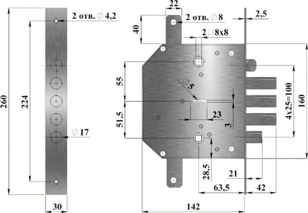 Замок врезной с фалевой защелкой, дополнительными тягами и внутренней задвижкой, имеет 8и-сувальдный блокирующий механизм сейфового типа. Замок сертифицирован 3 классом по ГОСТ 5089-2011, сохраняет работоспособность после попадания в скважину посторонних предметов. Запирание двери в трёх направлениях обеспечивает повышенную сопротивляемость к взлому и высокую степень защиты. Выпускается правого и левого исполнения. Толщина корпуса замка 24 мм. Запирание поворотом ключа, обеспечивает ригель, имеющий 3 пальца диаметром 17 мм, с вылетом 42 мм. Дополнительные тяги имеют ход 20 мм и обеспечивают запирание двери вверху и внизу. Защелка обеспечивает фиксацию двери и приводится в действие ручкой. Внутренняя задвижка работает от треугольной ручки. В модификации Эталон РЗТ+ -01 сертифицирован высшим 4 классом по ГОСТ 5089-2011.