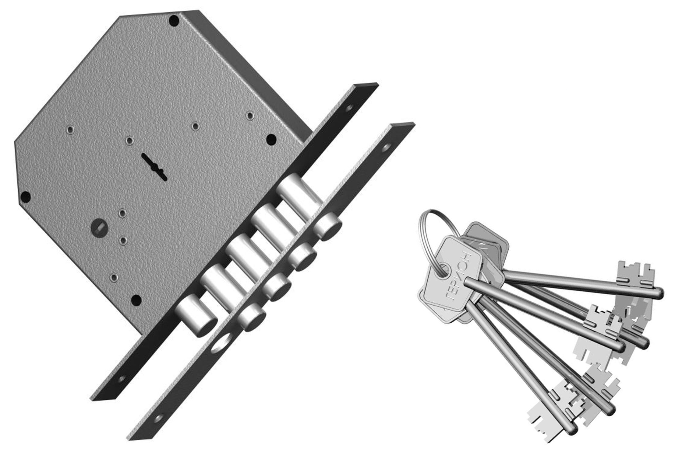 Замок врезной с четырехпалым ригелем, внутренней задвижкой и 8и-сувальдным блокирующим механизмом сейфового типа.