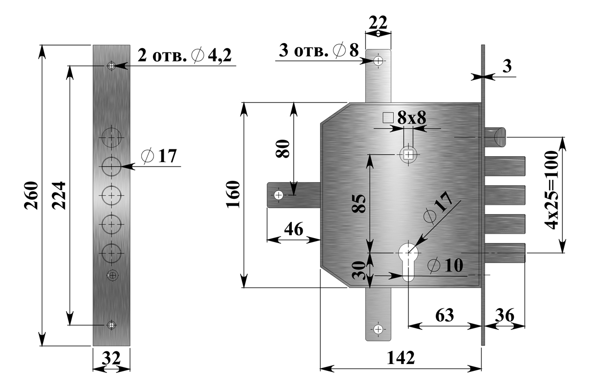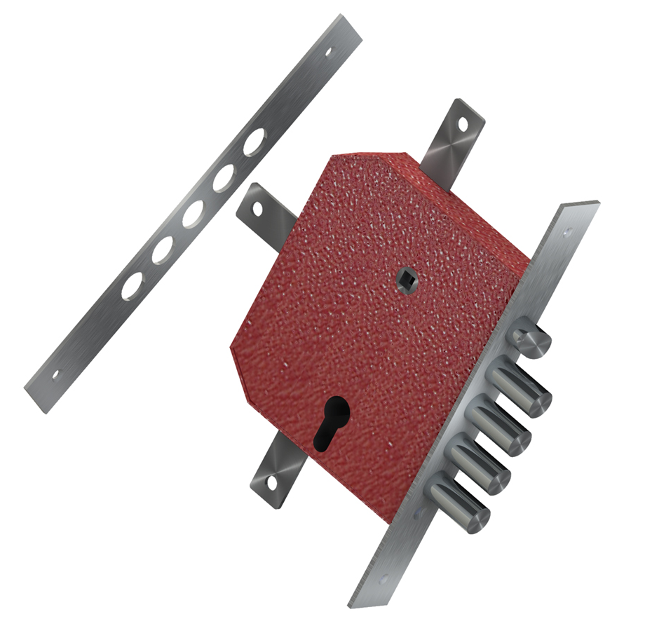 Запирание поворотом ключа обеспечивает ригель, имеющий четыре пальца диаметром 17 мм с вылетом 42 мм. Дополнительные тяги имеют ход 20 мм и обеспечивают запирание двери вверху, сбоку и внизу. Защелка обеспечивает фиксацию двери и приводится в действие ручкой.