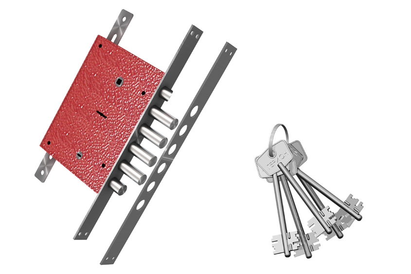 Замок врезной с четырехпалым ригелем, фалевой защелкой и внутренней задвижкой. Имеет 8и-сувальдный блокирующий механизм сейфового типа. Замок сертифицирован 3 классом по ГОСТ 5089-2011, сохраняет работоспособность после попадания в скважину посторонних предметов. Запирание двери обеспечивает повышенную сопротивляемость к взлому и высокую степень защиты. Выпускается правого и левого исполнения. Толщина корпуса замка 26 мм. Основной засов, состоящий из четырех пальцев диаметром 18мм, имеет вылет 40 мм и приводится в действие с помощью ключа. Защелка обеспечивает фиксацию двери и приводится в действие ручкой. Внутренняя задвижка работает от треугольной ручки.