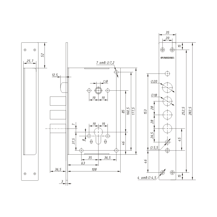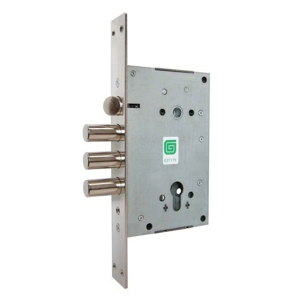 Отверстия для крепления врезной броненакладки усилены металлическими перегородками для защиты корпуса замка от деформации.