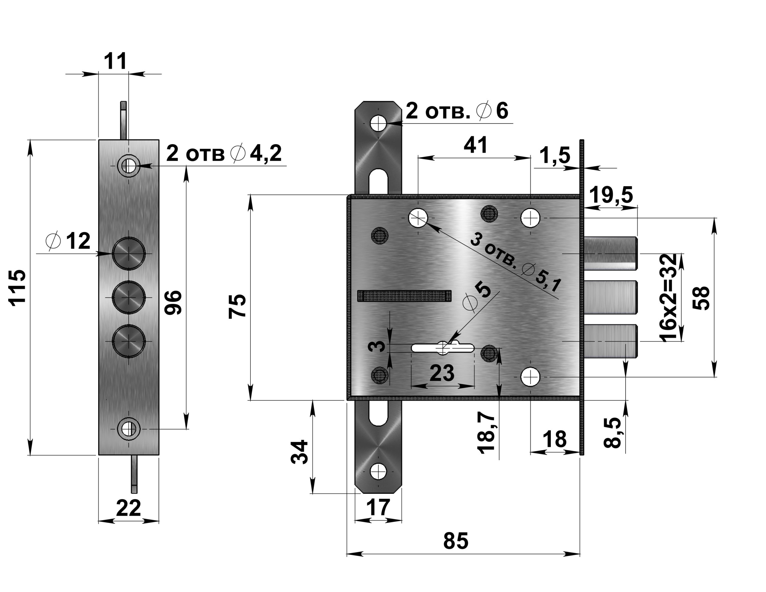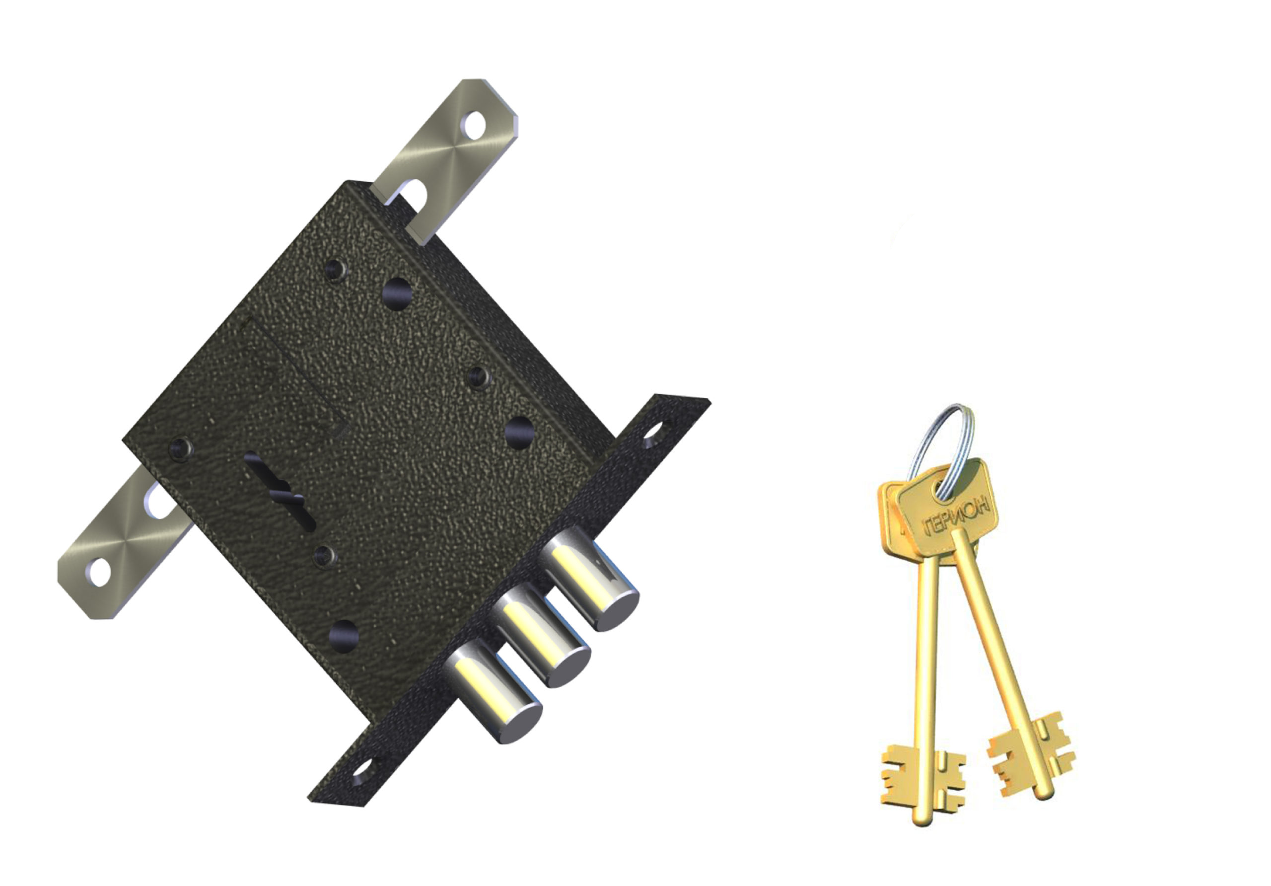 Толщина корпуса замка 18 мм. Запирание поворотом ключа обеспечивает трехпалый ригель диаметром 12 мм.