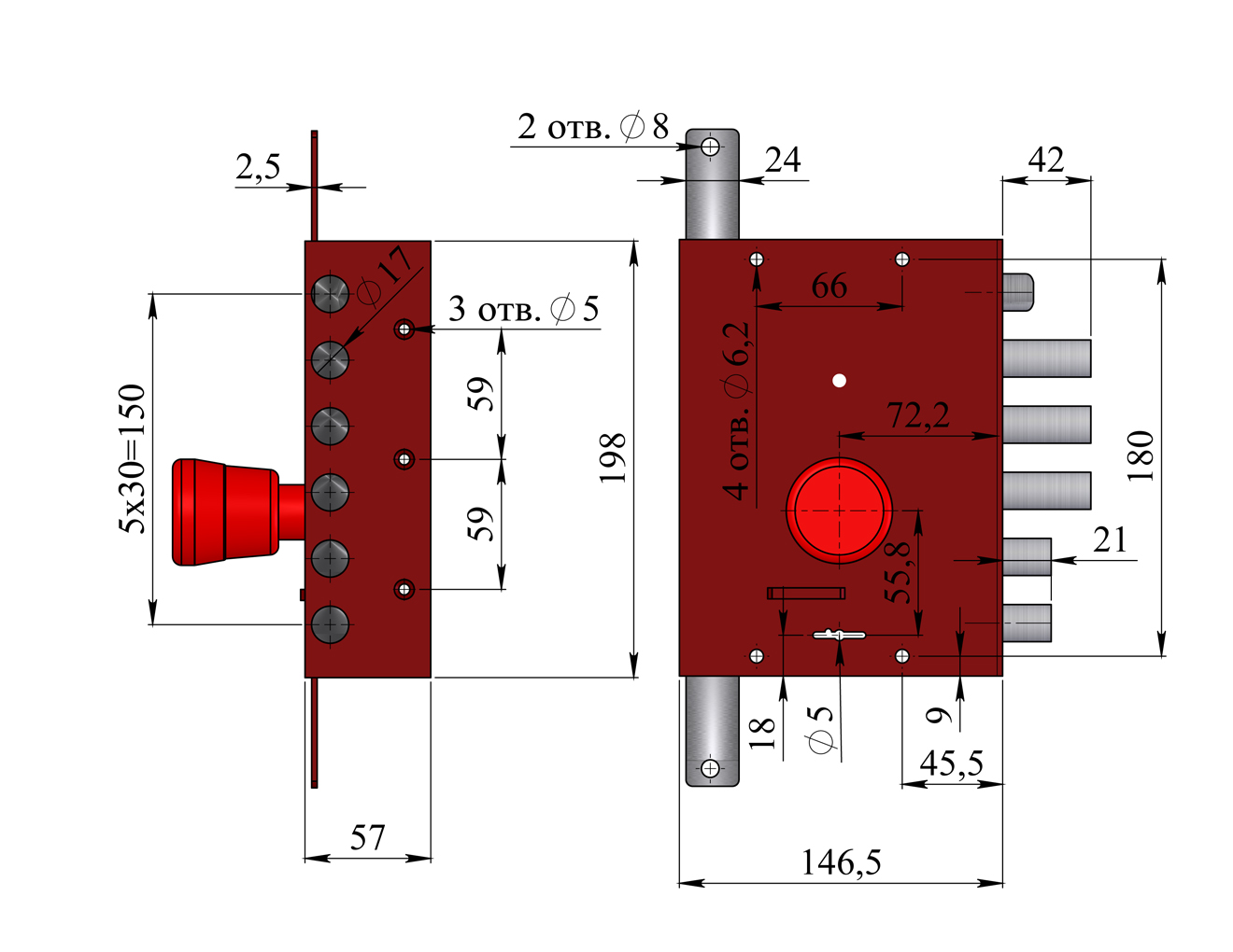 Замок накладной с фалевой защелкой и двумя дополнительными тягами. Имеет 8и-сувальдный блокирующий механизм сейфового типа. Замок сертифицирован 2 классом по ГОСТ 5089-2011, сохраняет работоспособность после попадания в скважину посторонних предметов. Запирание двери в трёх направлениях обеспечивает повышенную сопротивляемость к взлому и высокую степень защиты. Выпускается правого и левого исполнения. Толщина корпуса замка 26 мм. Основной засов, состоящий из трех пальцев диаметром 17мм, имеет вылет 40 мм и приводится в действие с помощью ключа. Окончательное запирание поворотом ключа обеспечивает ригель, имеющий два пальца диаметром 17 мм с вылетом 20 мм. Дополнительные тяги имеют ход 20 мм и обеспечивают запирание двери вверху и внизу. Защелка обеспечивает фиксацию двери и приводится в действие ручкой.