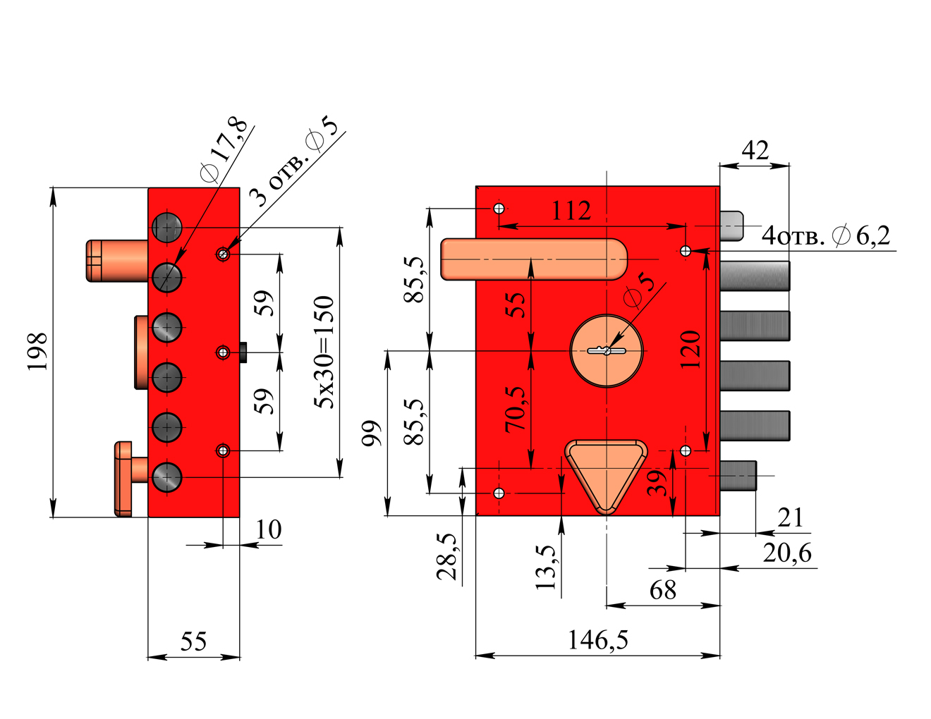 Замок накладной с четырехпалым ригелем, фалевой защелкой, двумя дополнительными тягами и внутренней задвижкой. Имеет 8и-сувальдный блокирующий механизм сейфового типа. Замок сертифицирован 3 классом по ГОСТ 5089-2011, сохраняет работоспособность после попадания в скважину посторонних предметов. Запирание двери обеспечивает повышенную сопротивляемость к взлому и высокую степень защиты. Выпускается правого и левого исполнения. Толщина корпуса замка 26 мм. Основной засов, состоящий из четырех пальцев диаметром 18 мм, имеет вылет 40мм и приводится в действие с помощью ключа.Защелка обеспечивает фиксацию двери и приводится в действие ручкой. Внутренняя задвижка работает от треугольной ручки.