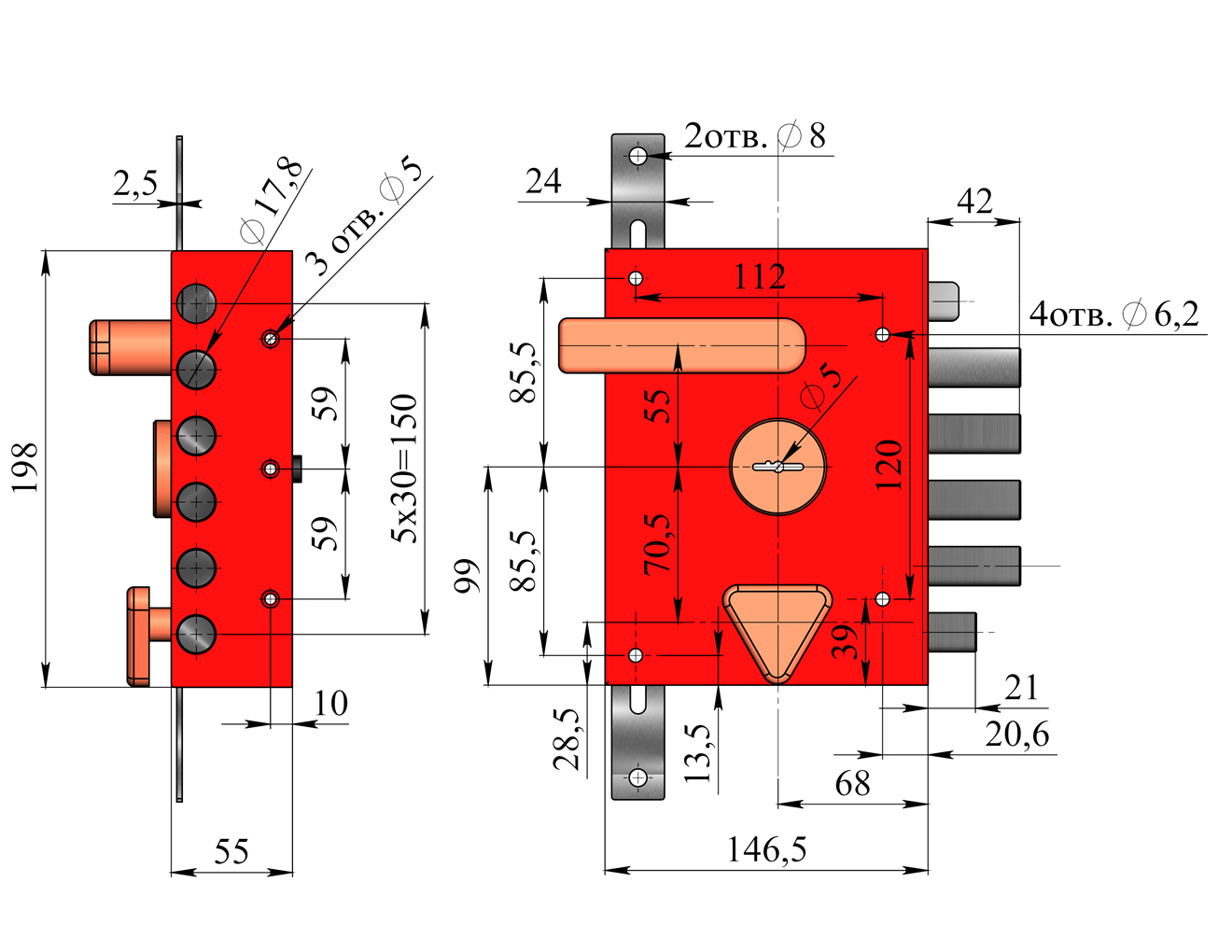 Замок накладной с четырехпалым ригелем, фалевой защелкой, двумя дополнительными тягами и внутренней задвижкой. Имеет 8и-сувальдный блокирующий механизм сейфового типа. Замок сертифицирован 3 классом по ГОСТ 5089-2011, сохраняет работоспособность после попадания в скважину посторонних предметов. Запирание двери в трёх направлениях обеспечивает повышенную сопротивляемость к взлому и высокую степень защиты. Выпускается правого и левого исполнения. Толщина корпуса замка 26 мм. Основной засов, состоящий из четырех пальцев диаметром 18 мм, имеет вылет 40 мм и приводится в действие с помощью ключа, дополнительные тяги имеют ход 20 мм и обеспечивают запирание двери вверху и внизу. Защелка обеспечивает фиксацию двери и приводится в действие ручкой. Внутренняя задвижка работает от треугольной ручки.