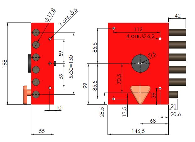 Замок накладной с пятипалым ригелем, двумя дополнительными тягами и внутренней задвижкой. Имеет 8и-сувальдный блокирующий механизм сейфового типа. Замок сертифицирован 3 классом по ГОСТ 5089-2011, сохраняет работоспособность после попадания в скважину посторонних предметов. Запирание двери обеспечивает повышенную сопротивляемость к взлому и высокую степень защиты. Толщина корпуса замка 26 мм. Основной засов, состоящий из пяти пальцев диаметром 18 мм, имеет вылет 40 мм и приводится в действие с помощью ключа. Внутренняя задвижка работает от треугольной ручки.